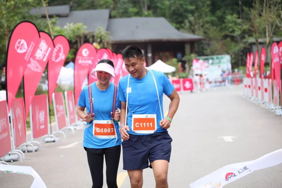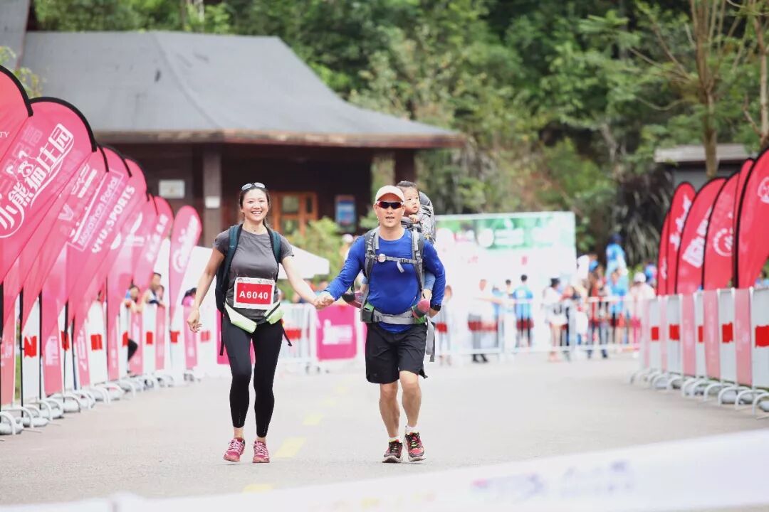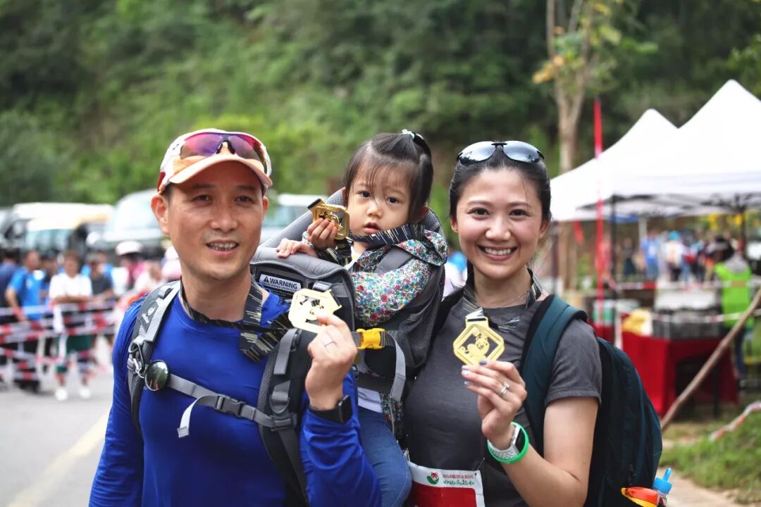 夫妻俩参加12公里组别,爸爸背着女儿,牵着妻子,一家三口幸福的冲向终点。