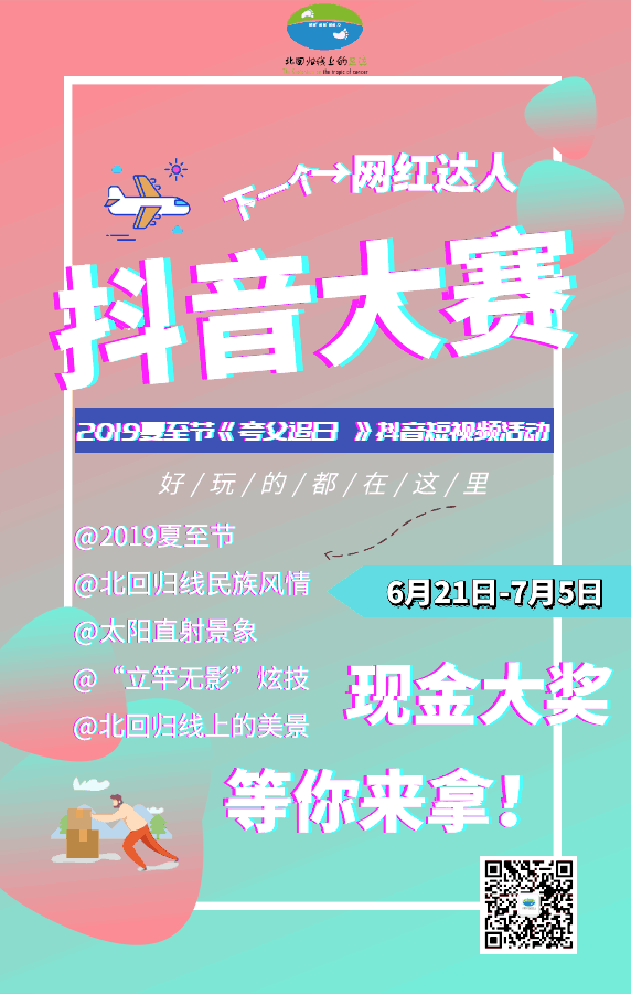 2、活动方式:通过大赛活动鼓励北回归线地区的公众拍摄夏至日太阳直射北回归线的奇特现象,以及有关节庆民俗文化活动、以及相关文旅活动的精彩瞬间,通过当下流行的短视频传播方式,将北回归线的风采展示给更多人。