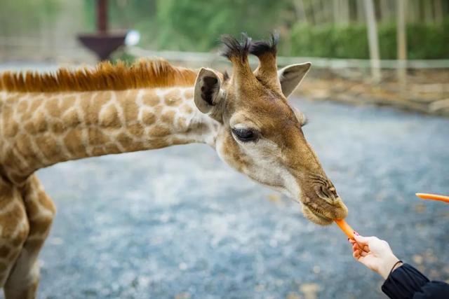 ▲湖州长颈鹿庄园内正在被游客喂食的长颈鹿