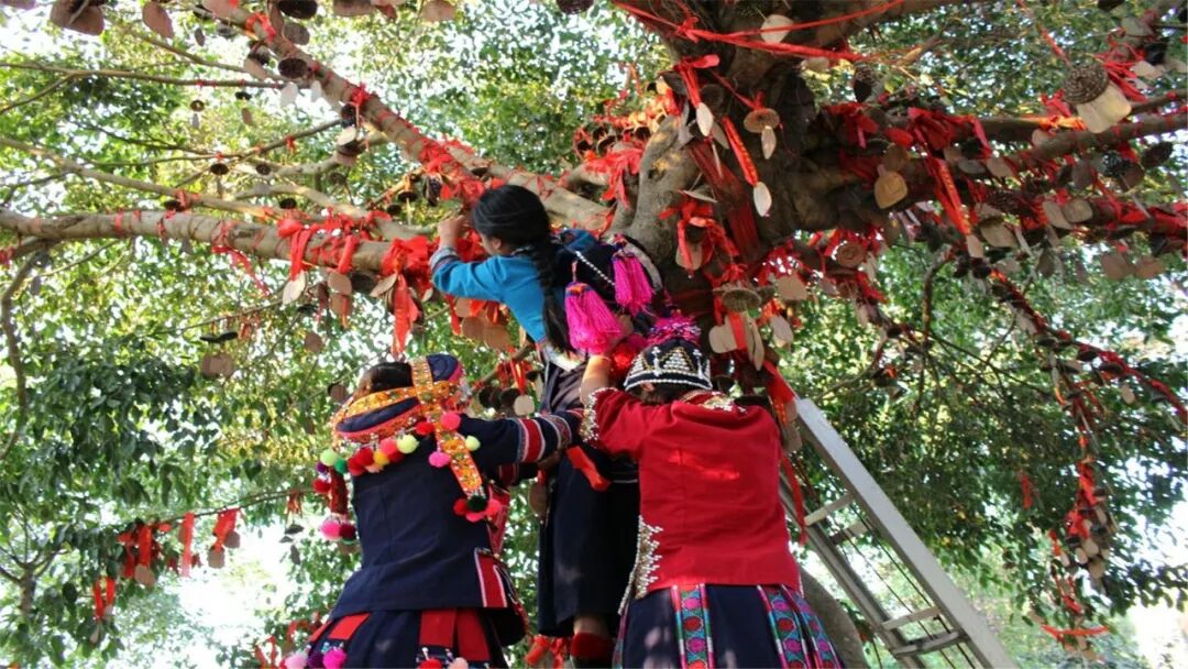 哈尼人高高挂起的红色丝带,许愿牌上写下美好的祝愿:远方的客人,您一定要来。