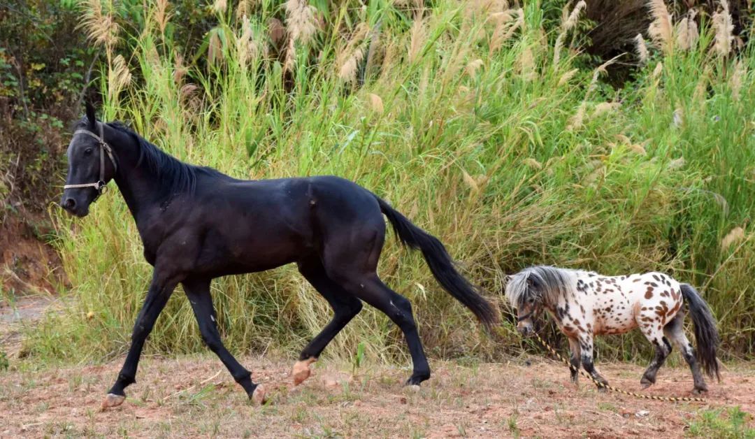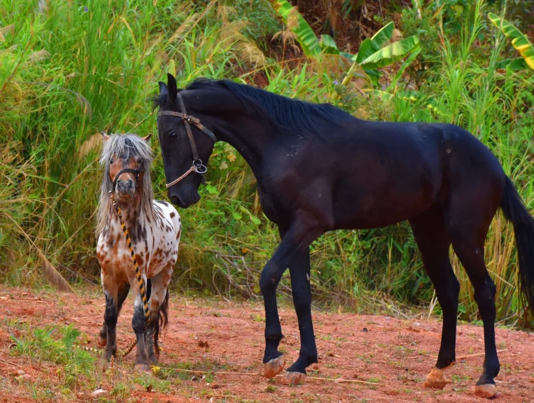 古道景区2岁的汗血宝马“小黑豹”弟弟高大魁梧,7岁的小矮马“史太兰”哥哥外形小巧可爱,但它们却是古道景区的一对好兄弟!