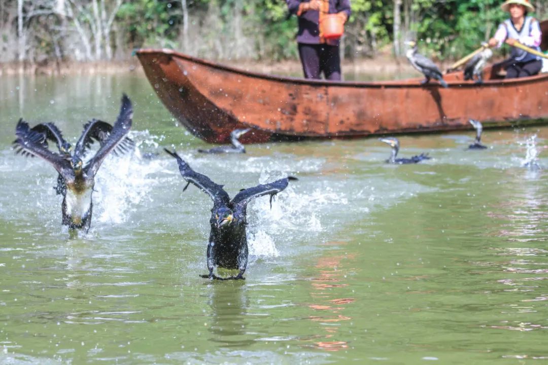 在大自然的画卷中,古色古香的亭台楼阁点缀其间,水面上安逸地飘着一艘渔船,两排安静整齐的鸬鹚鹤立船舷。这种被人类驯化了4000多年的禽类传承着我国千年的古老技艺,如今还被列为云南省非物质文化遗产。